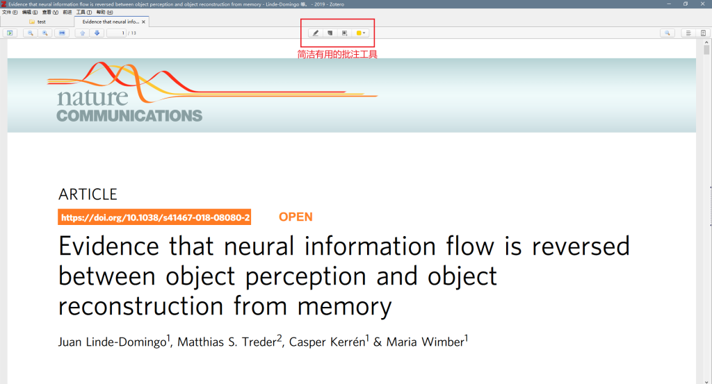 然后,回到zotero,发现条目已经添加完毕。由于该论文是open access的,所以Zotero Connector直接帮我们下载好了PDF附件。我们也可以自己下载附件后,添加到该条目。可以看到,该条目的索引信息已经建立。双击该条目,就能使用Zotero内置的PDF阅读器进行文献的阅读和批注。